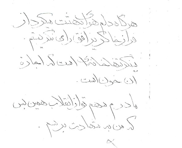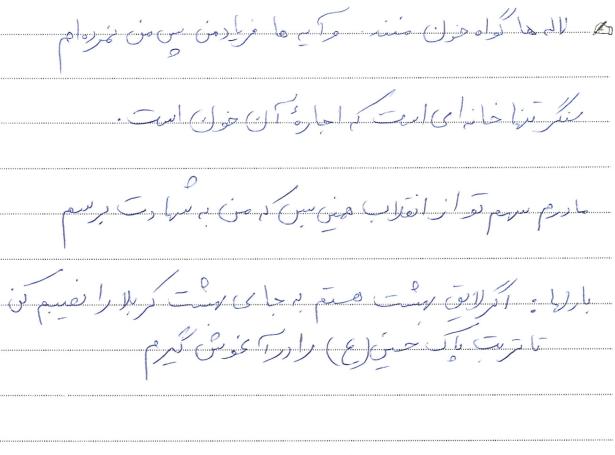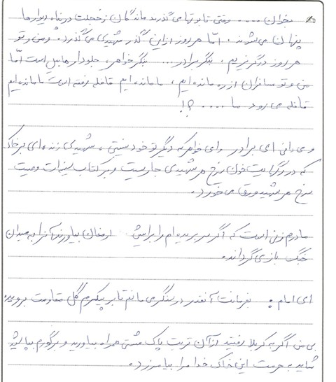 "اگر در این جنگ پاهایم قطع گردد با دست و اگر دستم قطع گردد با زبانم و اگر زبانم قطع شود با چشمم و اگر چشمم از کاسه درآید با آخرین وسیله بدنم که خونی در رگهایم جاری است انقلاب اسلامی خود را به رهبری قائد اعظم امام خمینی به تمام جهان صادر می کنم. خون خود را می دهم و شما بازماندگانم پیام خون مرا بدهید . . ."
